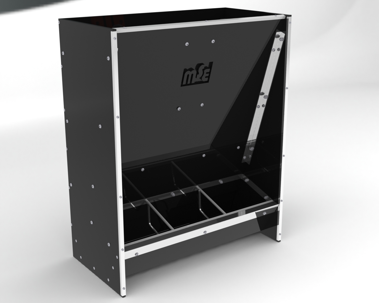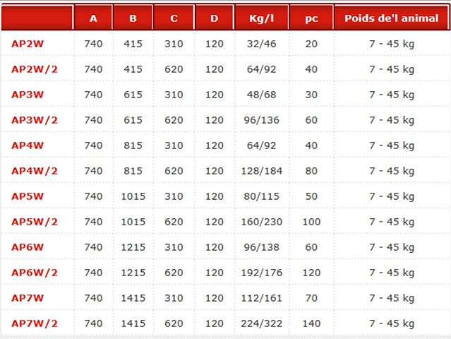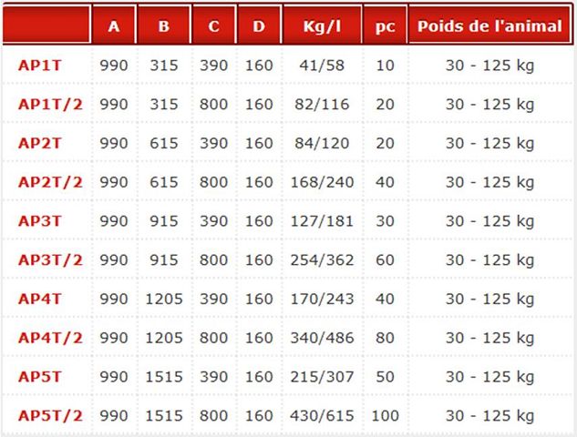 Différentes dimensions et options sont disponibles. Il est possible de produire un nourrisseur sur mesure. Les nourrisseurs sont fabriqués soit en PP plastique ou en Inox 304. Les nourrisseurs à sec sont garantis 5 ans.