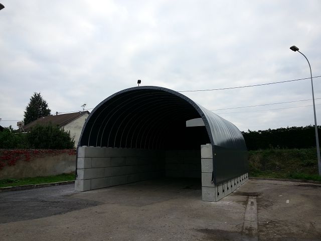 Tunnel posé sur plot béton ou sur dalle béton, destiné à tous les types de stockage : sel, sable, engrais, materiel BTP, recyclage, stockage produits vrac...