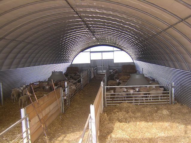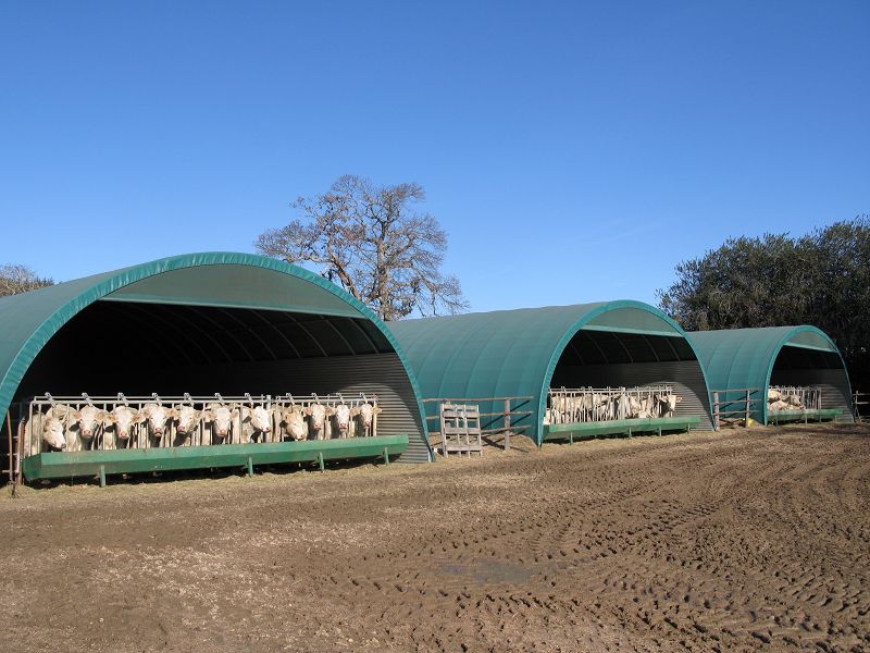 Options : Isolation en laine de verre de 80 à 160mm, ventilation par fenêtre et cheminée, bardage intérieur en tôle, pignon d'extrémité avec portes et portail.